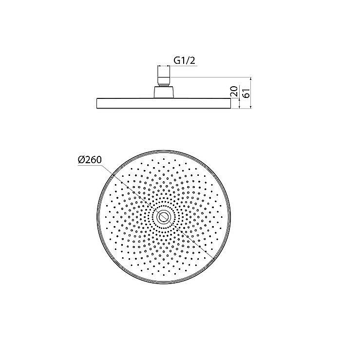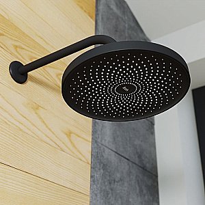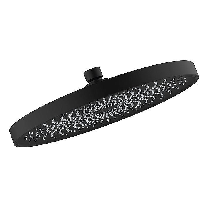 Верхняя лейка из ABS-пластика, диаметр 260 мм. Цвет: чёрный матовый, форсунки - белые. Шарнирное крепление. Материал: лейка из ABS-пластика, форсунки из силикона.