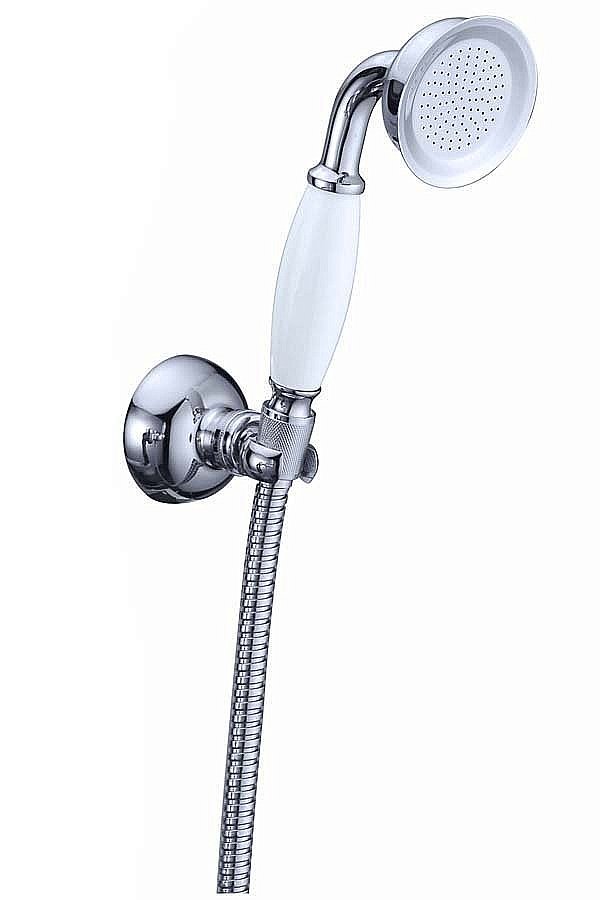 В комплекте: душевая лейка, шланг, держатель лейки. Материал: латунь. Количество режимов струи: 1. Металлический шланг, шланг в двойной оплетке 1500 мм. С системой против известковых отложений.