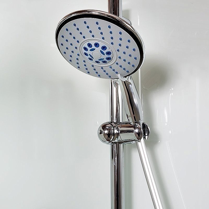 Душевая штанга с регулировкой лейки по высоте и ручная лейка с силиконовыми форсунками диаметром 140 мм с функцией переключения режимов
