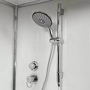 Душевая штанга с регулировкой лейки по высоте и ручная лейка с силиконовыми форсунками диаметром 140 мм с функцией переключения режимов;
