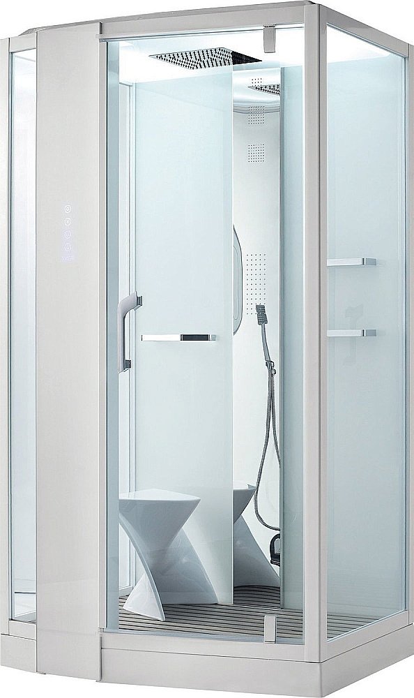 Комплектация: Турецкая баня, верхний душ, гидромассаж, полочки, хромированный полотенцедержатель, FM радио, вентиляция, сиденье, озонация, ручной душ, решетка в поддоне из композитного материала с имитацией структуры дерева, отдельностоящее акриловое сиденье.