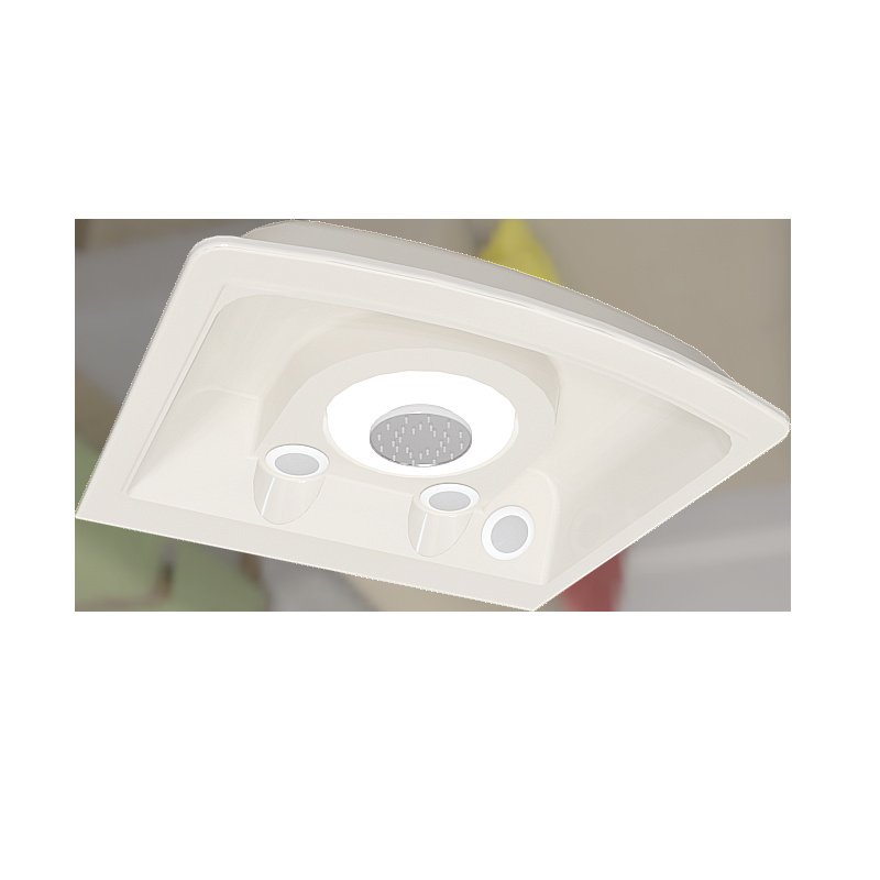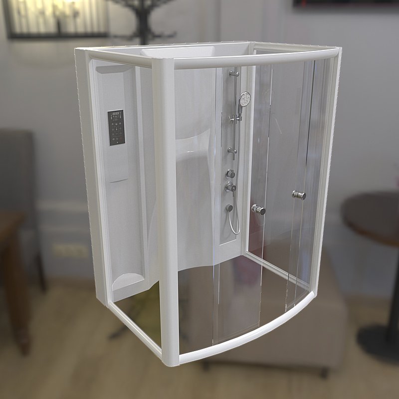 В комплекте: поддон на раме-подставке с устройством слива, задняя стенка, крыша, стеклянные шторки, вертикальный душ «Тропический дождь», смеситель, душевая лейка, 3 стеклянные полочки.