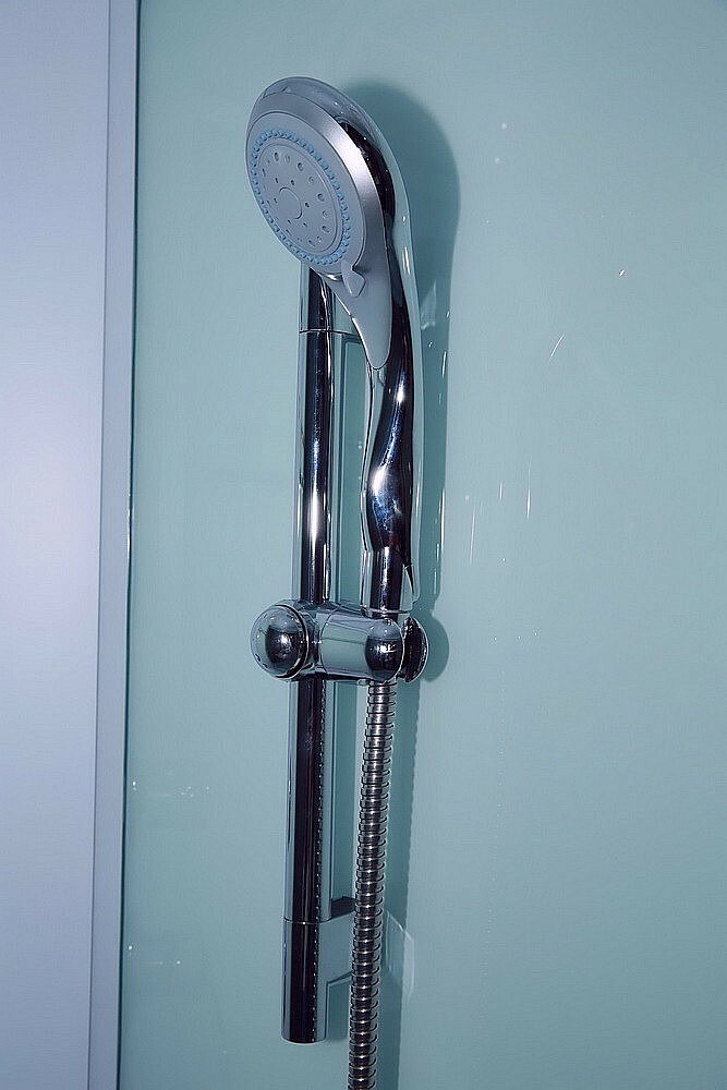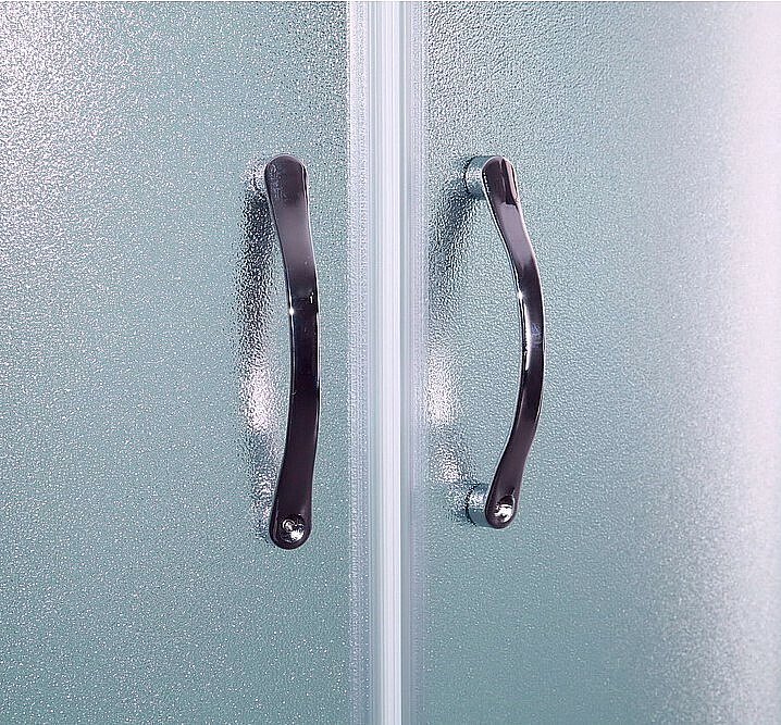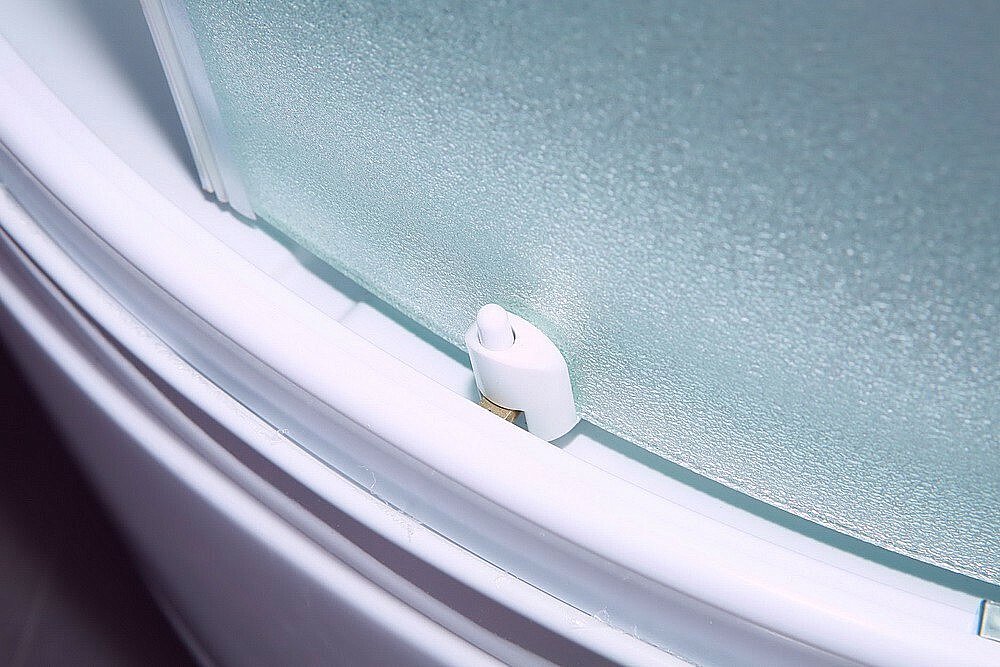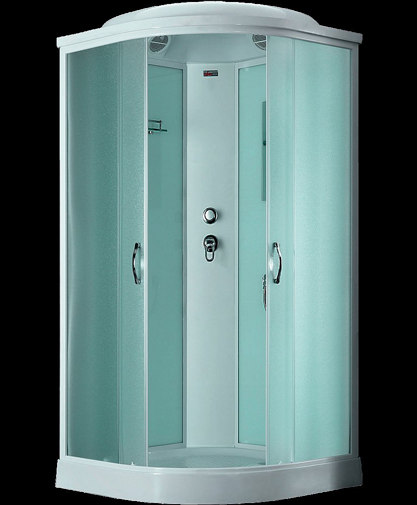 Акриловый поддон h - 15см; Хромированный слив с сифоном; Алюминиевый профиль - белый матовый; Задние стенки - стеклянные белые; Передние стекла - структурные матовые; Смеситель однорычажный - 2 режима; Тропический душ; Массажная лейка; Саморегулирующие ролики; Стеклянная полочка; Зеркало; Ручки.
