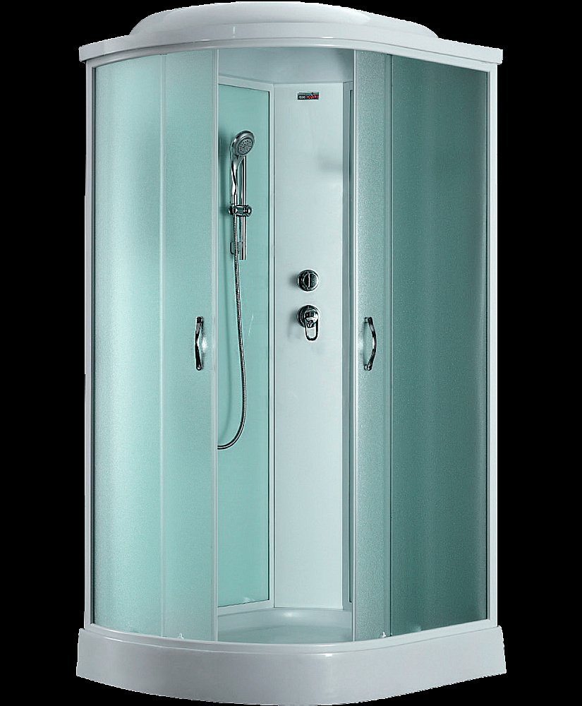 Акриловый поддон h - 15 см; Хромированный слив с сифоном; Алюминиевый профиль - белый матовый; Задние стенки - стеклянные белые; Передние стекла - структурные матовые; Смеситель однорычажный - 2 режима; Тропический душ; Массажная лейка; Стеклянная полочка; Зеркало; Ручки.