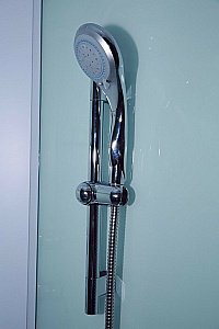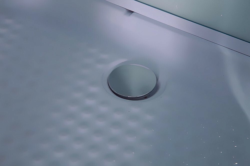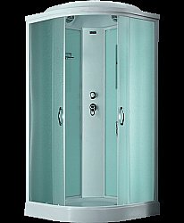 Акриловый поддон h - 15 см; Хромированный слив с сифоном; Алюминиевый профиль - белый матовый; Задние стенки - стеклянные белые; Передние стекла - структурные матовые; Смеситель однорычажный - 2 режима; Тропический душ; Массажная лейка; Стеклянная полочка; Зеркало; Ручки.