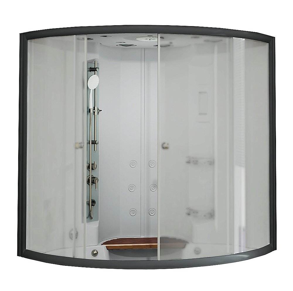 В комплекте: чаша ванны, рама-подставка, слив-перелив полуавтоматический, фронтальная панель, боковые стенки, центральная стойка, крыша, стеклянные шторки, вертикальный душ "Тропический дождь", смеситель, излив, 2 стеклянные полочки, ручной душ.