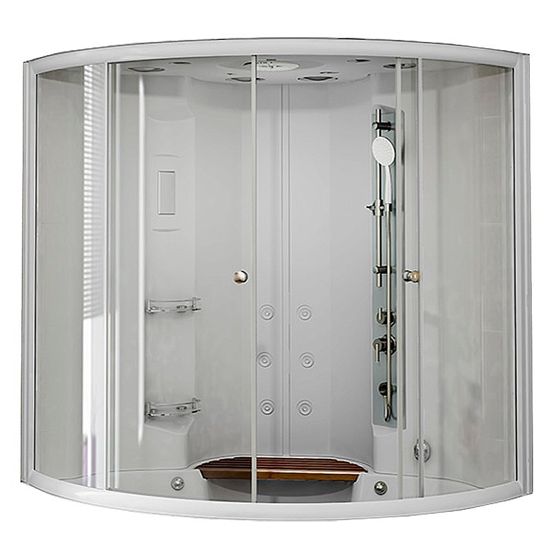 В комплекте: чаша ванны, рама-подставка, слив-перелив полуавтоматический, фронтальная панель, боковые стенки, центральная стойка, крыша, стеклянные шторки, вертикальный душ "Тропический дождь", смеситель, излив, 2 стеклянные полочки, ручной душ.