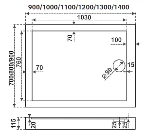 Низкий акриловый поддон прямоугольной формы высотой 5.5 см. Отдельно приобретаются сифон, ножки и экран на магнитной застежке. Максимальная высота при установке на ножки - 15 см.