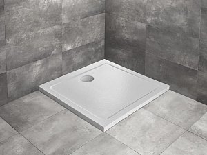 Плоский квадратный акриловый поддон, приспособленный под сифон с квадратной крышкой, с отверстиемØ90мм, предназначенный для монтажа непостедственно на полу. Рекомендуемый сифон R399.