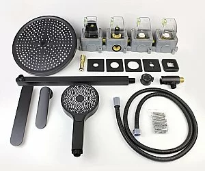 Состав поставки Смеситель для душа, верхний душ, ручной душ, шланг для ручного душа,излив, комплектующие, крепления,