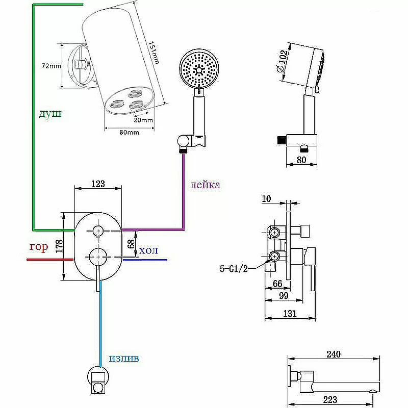 Диаметр ручного душа: 102 мм.