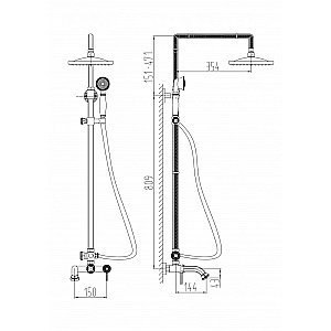 В комплект входит: смеситель, крепежный комплект (эксцентрик 2 шт, отражатель смесителя 2 шт, отражатель душевой штанги 1 шт), душевая штанга ( нижняя ) с держателем ручной лейки, душевая штанга верхняя, верхний душ, ручная лейка, душевой шланг 150 мм, тройник с выходом под душевой шланг, паспорт/гарантийный талон.
