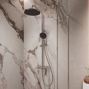 В комплекте: верхний душ, душевая лейка, смеситель, термостатический картридж Vernet, девиатор, душевой шланг 150 см