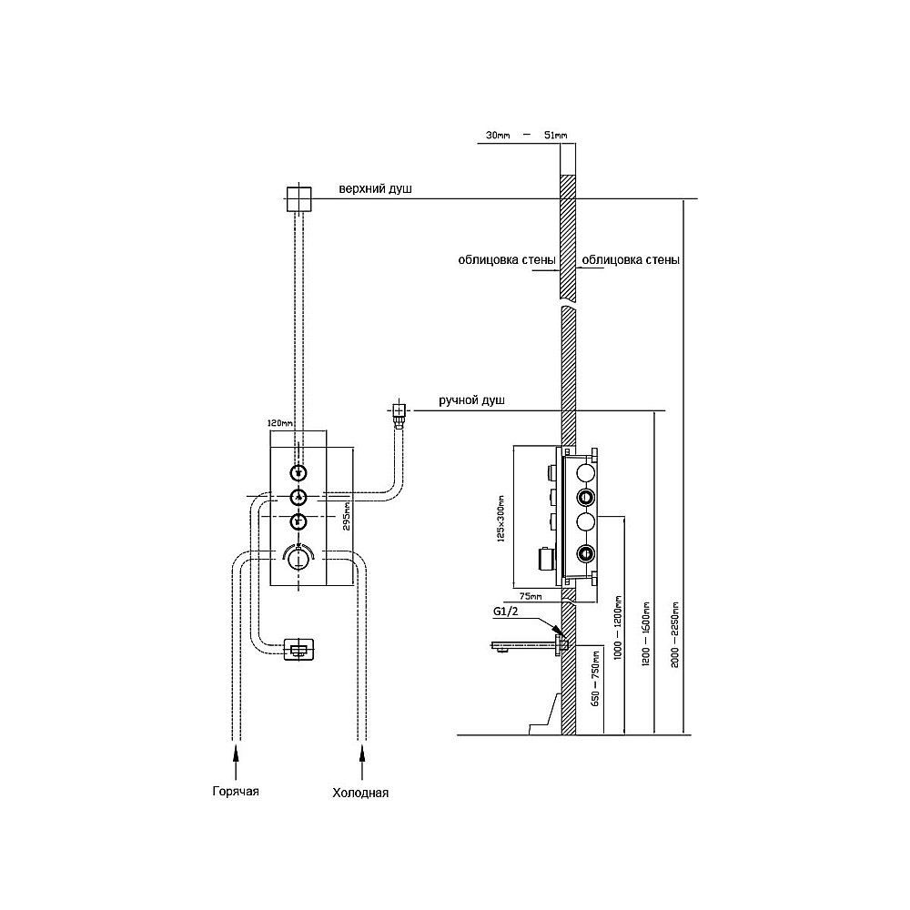 Комплектация: Верхний душ, ручной душ, встраиваемый смеситель, излив.