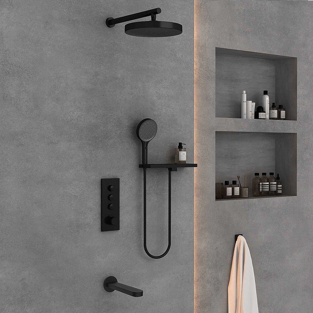 Комплектация: Верхний душ, полка с держателем ручного душа, ручной душ, смеситель со встраиваемой частью.