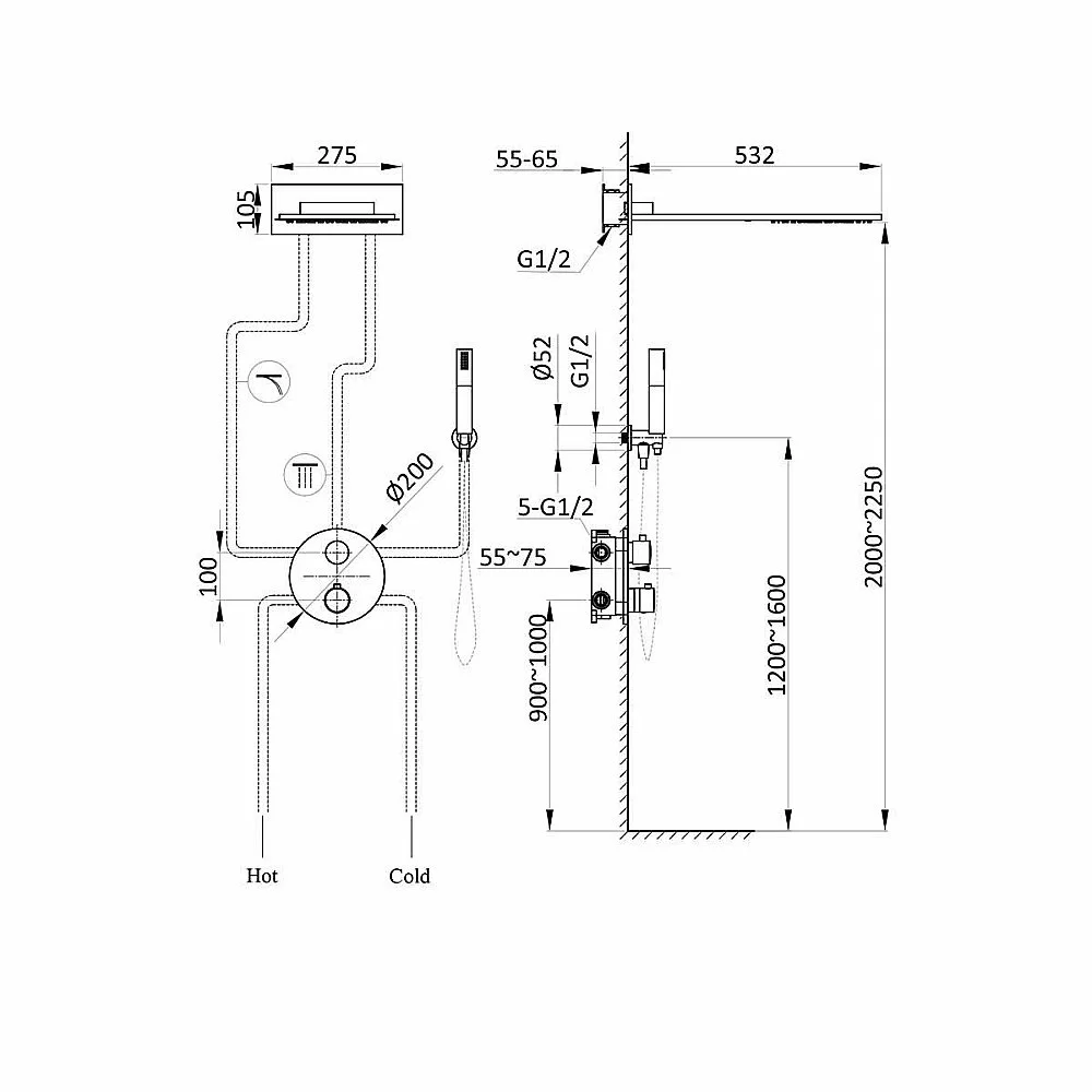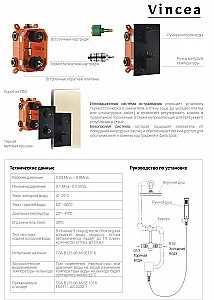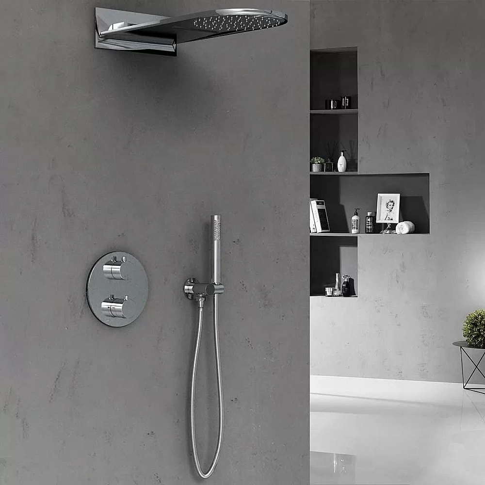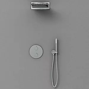 В комплекте: верхний душ, ручной душ, смеситель со встраиваемой частью, термостатический картридж Vernet, девиатор, душевой шланг 150 см