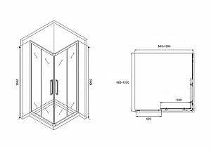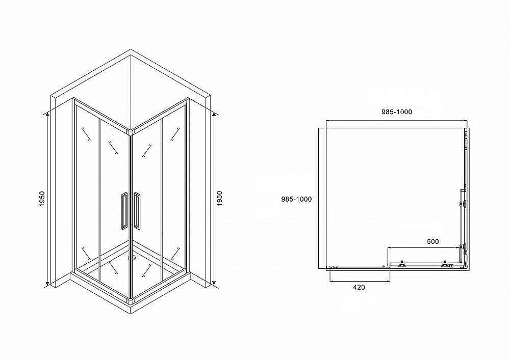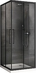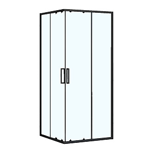Квадратный душевой уголок Двери: две раздвижные Стекло: закаленое прозрачное 6 мм Профиль: черный Особенности: • увеличенные металлические ручки • двойные металлические ролики • поддон приобретается отдельно