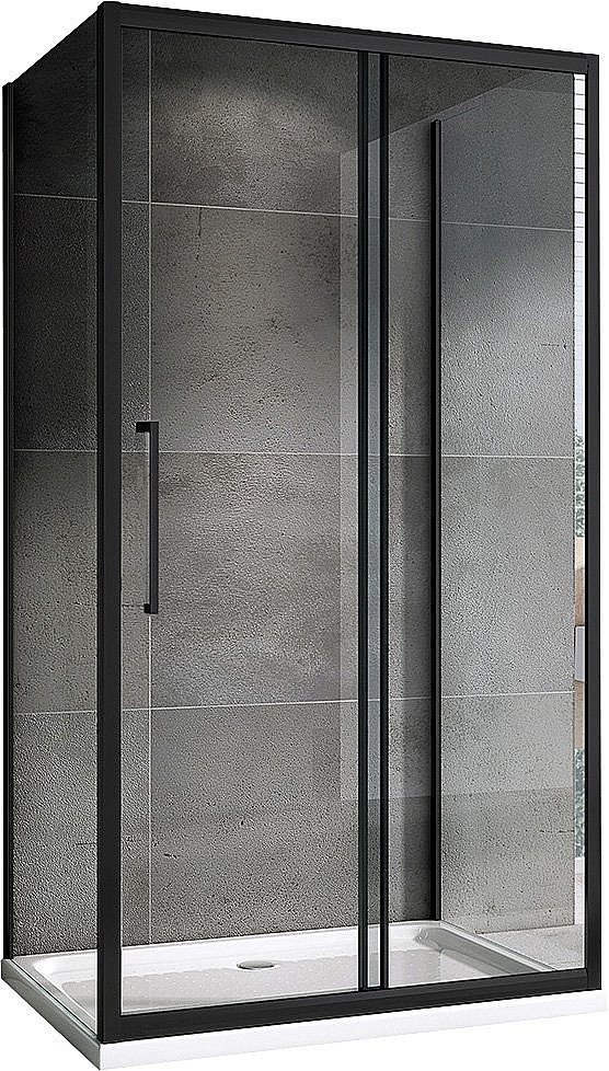 Прямоугольный П-образный душевой уголок, пристенная установка Двери: одна раздвижная Стекло: закаленое прозрачное 6 мм Профиль: черный Особенности: • увеличенные металлические ручки • двойные металлические ролики • универсальный монтаж • поддон приобретается отдельно
