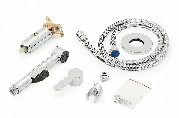 В комплекте: накладка, внутренняя часть смесителя, внешняя часть смесителя с держателем лейки, гиг.лейка, шланг, инструкция.
