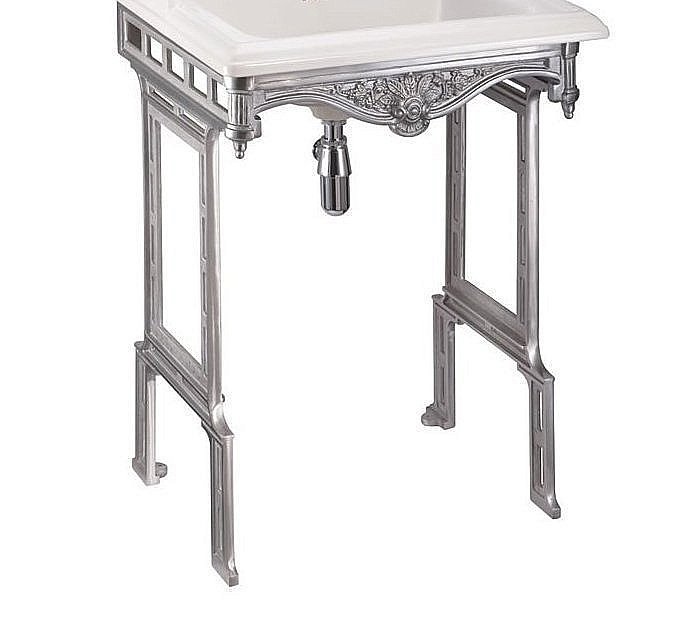 Роскошная раковина с серебристым подстольем из полированного алюминия, украшенным вычурными узорами, создана для таких же  роскошных интерьеров. Высокий бортик раковины придаст оригинальности помещению, но и сделает ваши умывальные процедуры более практичными.