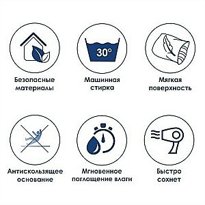 Назначение: Коврик для ванной комнаты. Материал: Антискользящее основание (термопластичная резина), микрофибра. Покрытие: Микрофибра. Описание: размер 550 х 570 мм, высота ворса 30 mm. Коврики подлежат машинной стирке при температуре не выше 30 градусов в режиме бережной стирки.