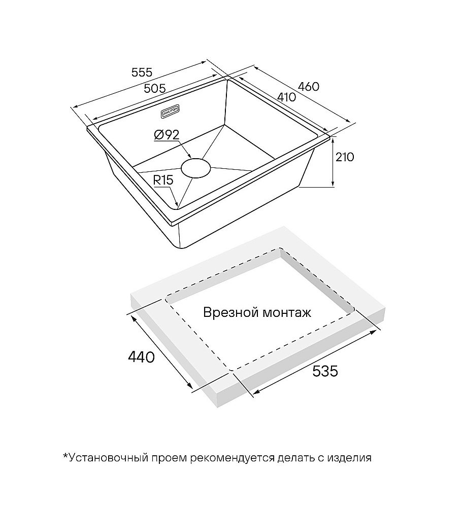 Мойка создана как для современного способа монтажа под столешницу, так и для классического врезного монтажа.