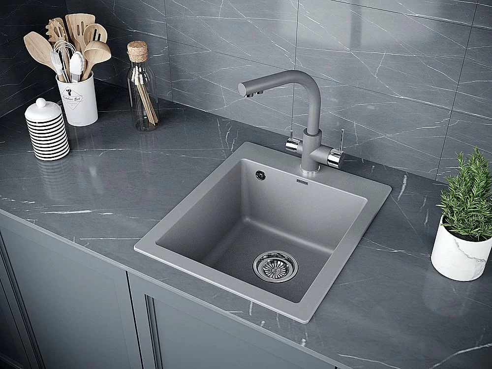 Состав кварцевой мойки не вступает в реакцию с продуктами и полностью безопасен для здоровья человека. Материал мойки экстремально устойчив к механическим повреждениям, а также обладает повышенной термоустойчивостью и пожаробезопасностью. Идеален для ограниченного кухонного пространства. Прекрасно впишется в любой интерьерный стиль.