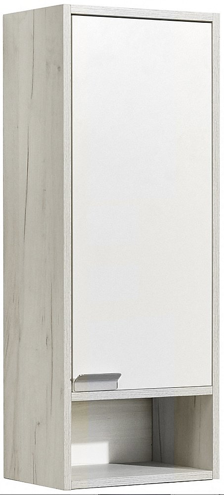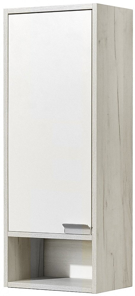 Корпус шкафчика Флай выполнен из влагостойкой ламинированной плиты в трендовом декоре дуб крафт. Фасад окрашен в белоснежный глянцевый цвет полиэфирной краской ультрафиолетового отверждения. Такой способ окрашивания обеспечивает изделию привлекательный внешний вид, а также  износостойкость и долговечность. Фасад открывается с помощью изящной и оригинальной ручки от европейского производителя (Испания), петли снабжены доводчиками для комфортного использования. Небольшая открытая ниша идеально подойдет для размещения декора для ванной комнаты или необходимых мелочей. При желании можно разместить два шкафчика Флай один под другим и получить вместительную шкаф-колонну с двумя открытыми нишами. Петли могут быть расположены справа или слева.