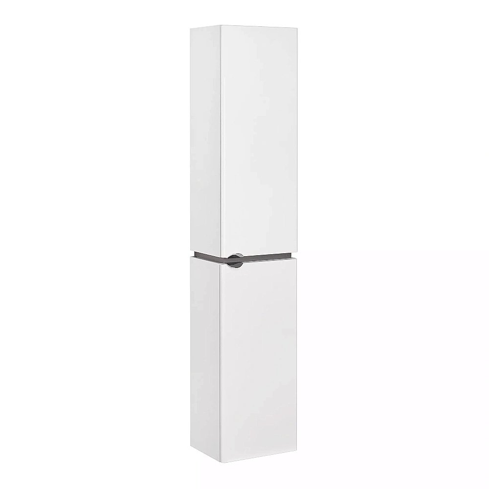 Подвесная шкаф-колонна Скай сочетает в себе ультра-белые глянцевые фасады с декоративной вставкой в цвете "серый кашемир". Чистоту линий фасадов подчеркивают эргономичные хромированные ручки.