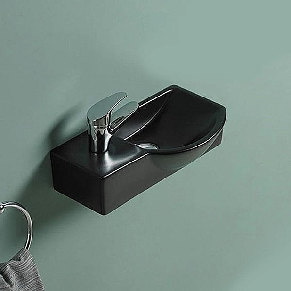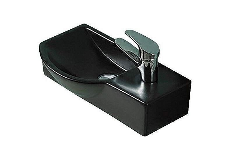 Размер: 40,5 × 22,5 × 10 см Особенности: Стильная чёрная модель с современным характером. Оборудована переливом и отверстием под смеситель.