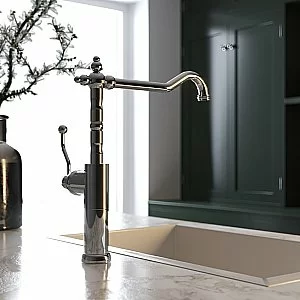 Однорычажный смеситель для кухни сочетает в себе винтажный стиль с современной начинкой и функциональностью. Затейливая форма рычага делает стиль ретро удобным и практичным.