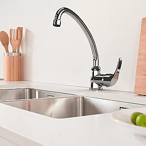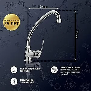 Высокий излив смесителя JOLLY удобен для манипуляций с посудой и подходит для обработки продуктов водой.