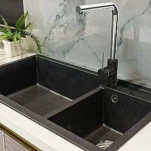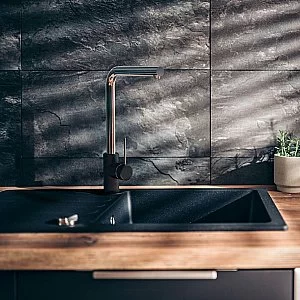 Однорычажный смеситель PIEMONTE для кухни выполнен в цвете “темно-серый гранит” с вкраплениями хромовых элементов, добавляя красок в интерьер. Благодаря высокому корпусу и поворотному изливу этот смеситель позволяет менять направление потока воды, использовать глубокую посуду, а выдвижной излив дает возможность легко набрать воду в глубокие емкости вне мойки, сполоснуть посуду разной формы. Удобный рычаг расположен сбоку, что позволяет открыть воду локтем, если руки испачканы. Прямые углы и цилиндрический корпус PIEMONTE отлично подойдут для кухонь различных размеров и стилей, например, классика, модерн или минимализм.