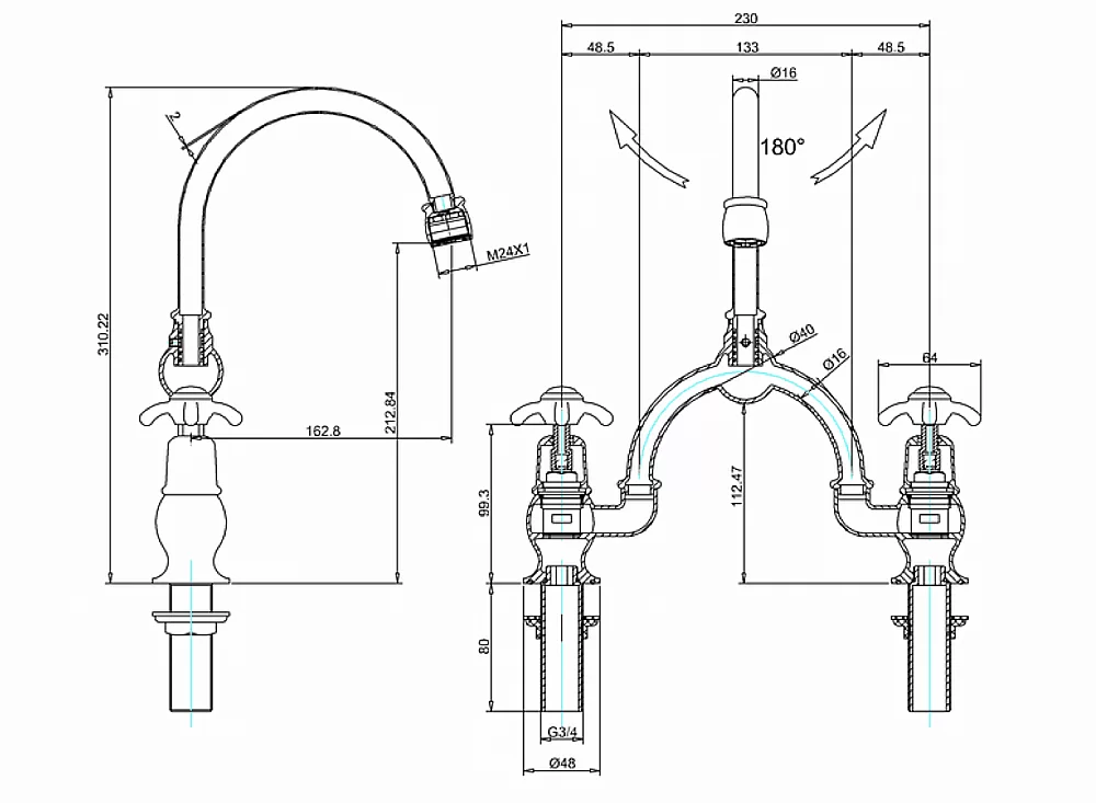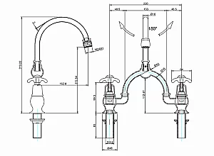 T25-QT Смеситель на 2 отверстия (излив 230 мм),1/4 оборота, цвет Хром