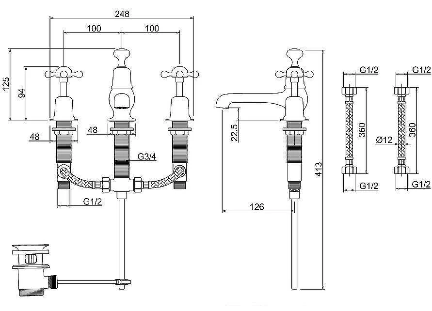 - Смеситель на раковину с 3 отверстиями с автоматическим сливом “Pop-up”, 1/4 оборота.