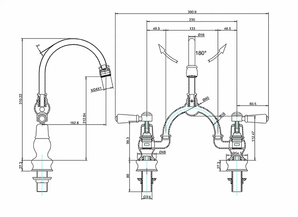 - Смеситель на 2 отверстия (излив 230 мм),1/4 оборота.