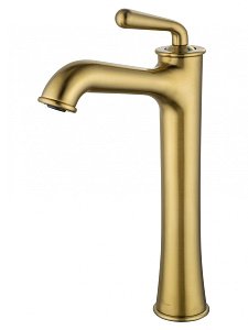 Высокий смеситель с покрытием цвета брашированного золота и стойкой PVD-обработкой. Идеален для установки на раковины с высокими чашами.