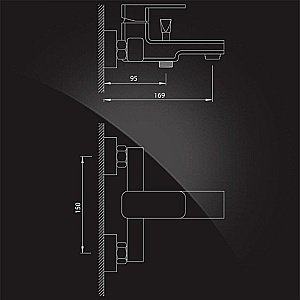 Материал: латунь. Вес 2,4 кг. По цвету: хром. Тип управления: однорычажные смесители. Особенности: короткий излив. Тип излива: стационарный, литой. Длина излива: 169 мм. Отверстия для монтажа: на два отверстия. Тип монтажа: настенный. Тип картриджа: керамический арт. KL-35-500. Душевая группа: шланг с лейкой. Тип душевого шланга: металлический. Длина душевого шланга: 150 см. Тип ручного душа: пластик. Тип переключателя: керамический. Стиль: хай-тек (high-tech).