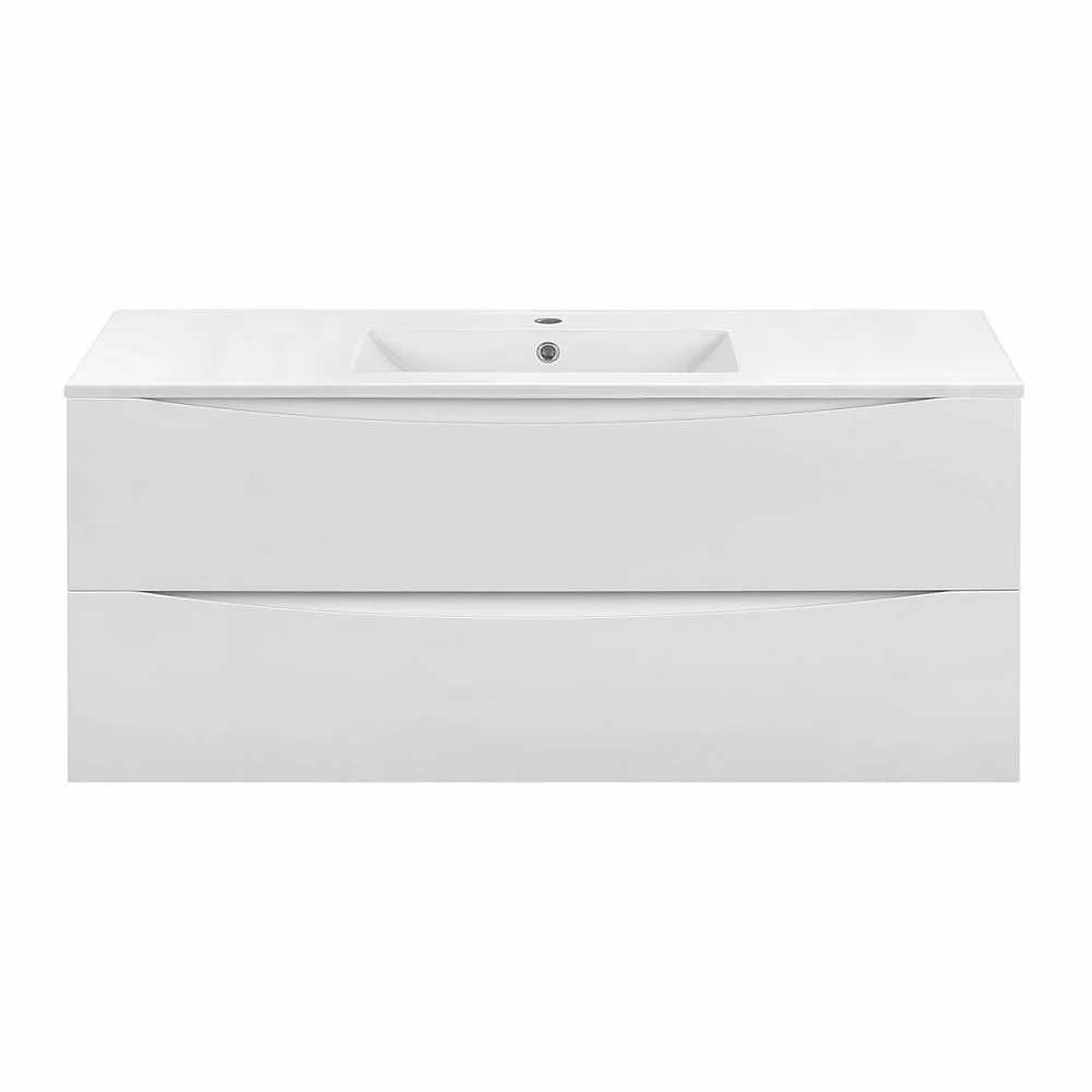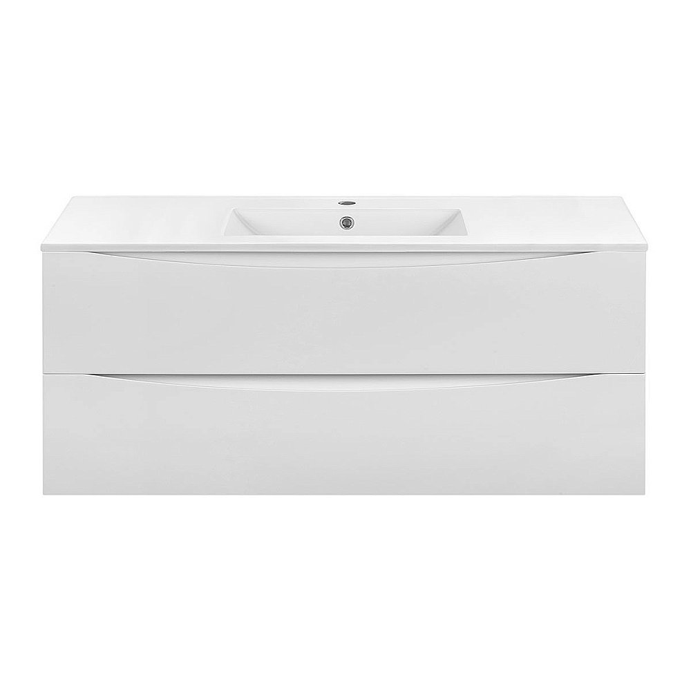 Мебель для ванной Тип: подвесная Система хранения: 2 выкатных ящика с доводчиками Ручки фрезерованы в плоскости фасада под 45º На фото представлена мебель в отделке G.White ( белый глянец )
