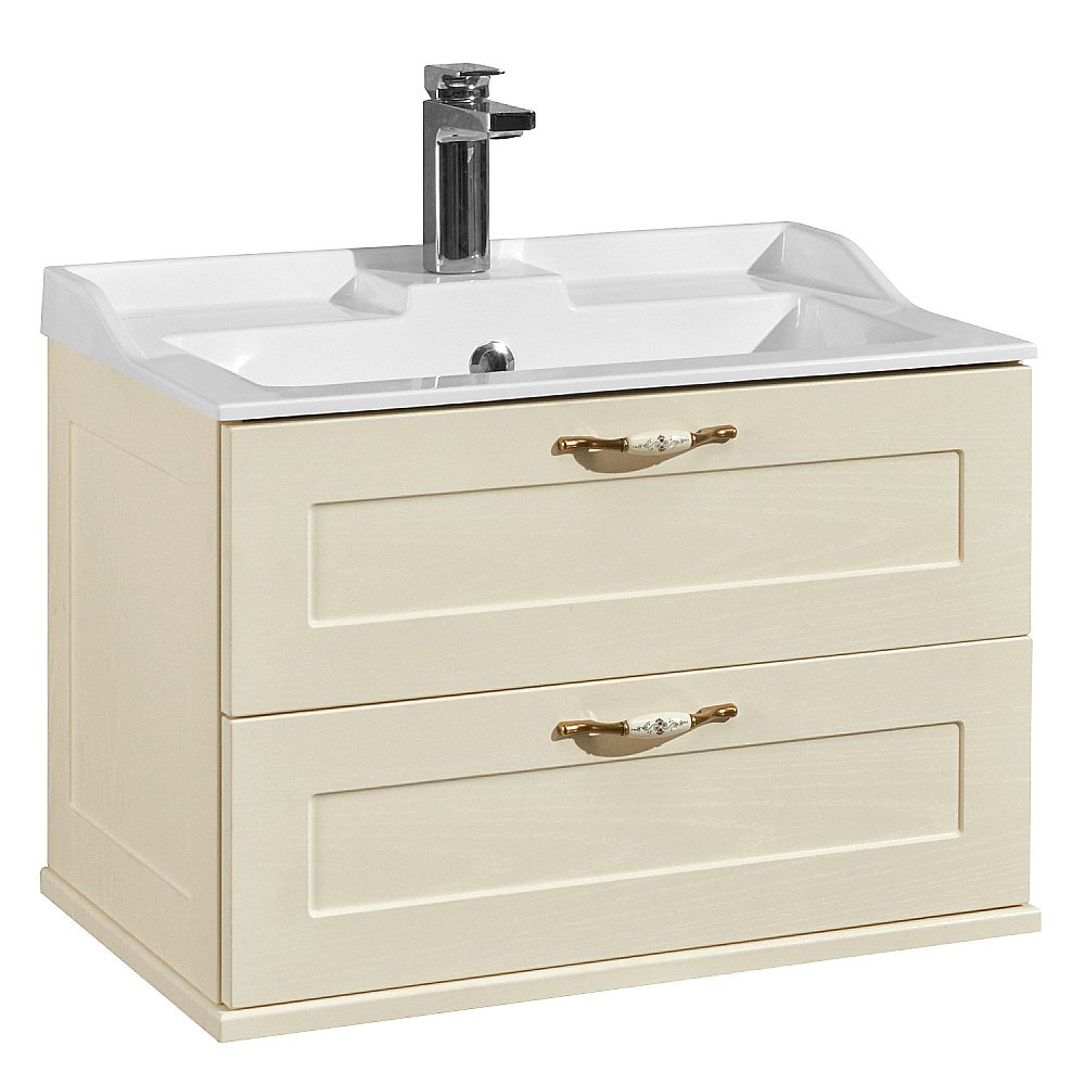 Набор мебели для ванной Акватон из коллекции Леон состоит из раковины и подвесной тумбы, имеющей 2 выдвижных ящика для хранения косметических средств, банного текстиля.