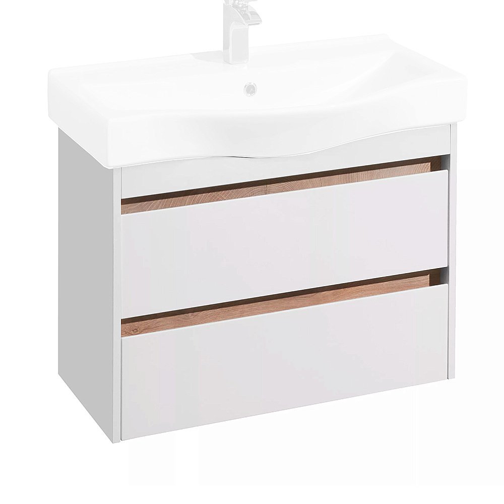 Конструктивно тумба состоит из 2 вместительных ящиков, установленных на направляющие с доводчиками для комфортного использования. На тумбе нет выступающих деталей и фурнитуры, открытие ящиков реализовано за счет удобного выреза на фасаде. Тумба комплектуется белоснежной раковиной Беверли от бренда Santek.