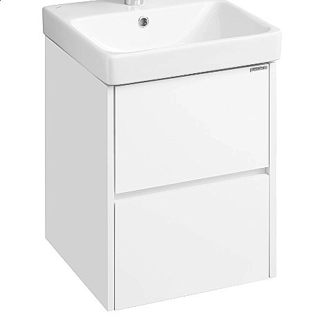 Тумба Сканди 45 выполнена в популярном минималистичном скандинавском стиле. Корпус тумбы выполнен из влагостойкой ЛДСП в белой матовой покраске, а фасады в белой глянцевой покраске. Конструктивно тумба состоит из 2 вместительных ящиков, установленных на направляющие с интегрированной системой push-to-open для комфортного использования. На тумбе нет выступающих деталей и фурнитуры, открытие ящиков реализовано нажатием на фасад. Тумба комплектуется белоснежной раковиной Адриана.