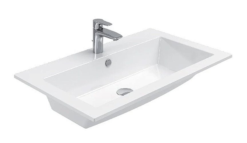 Корпус и фасады тумбы из влагостойкого ЛДСП. Сверху установлена раковина «Электра» из литьевого мрамора. У нее максимально глубокая и объемная чаша, но все внутренние детали скруглены.