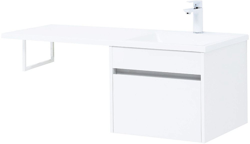 Тумба с раковиной Aquanet Токио 110 (подвесная, 1 ящик) белого цвета представляет новый формат тумб производства Aquanet. Раковина из литьевого мрамора имеет длинную платформу, которая выходит далеко за пределы тумбы. Она предназначена для того, чтобы установить с правой стороны от тумбы стиральную машину. Платформа имеет такую длину, которая позволит спрятать под нее машинку средних размеров с фронтальной загрузкой. Корпус тумбы выполнен из влагостойкого ЛДСП, а фасад – из МДФ с покрытием эмалью. В подвесной тумбе шириной 480 мм место хранения предусмотрено в выдвижном ящике, оборудованном доводчиками, чтобы ход ящика при открывании/закрывании был плавным и без неприятных звуков. Тумбу можно использовать и без соседства со стиральной машиной, а свободное пространство под платформой раковины занять подкатной тумбой, полочками для полотенец или столиком.