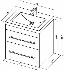 Тумба с раковиной Aquanet «Верона» 60 в цвете «капучино» дополнена двумя вместительными выдвижными ящиками. На фронтальной стороне каждого из них прикреплены длинные серебристые ручки. Доводчики обеспечивают плавное и бесшумное закрывание. Модель подвесного типа. Корпус изготовлен из влагостойкого ЛДСП, фасады — из МДФ. Габариты — 570х477х605 мм.