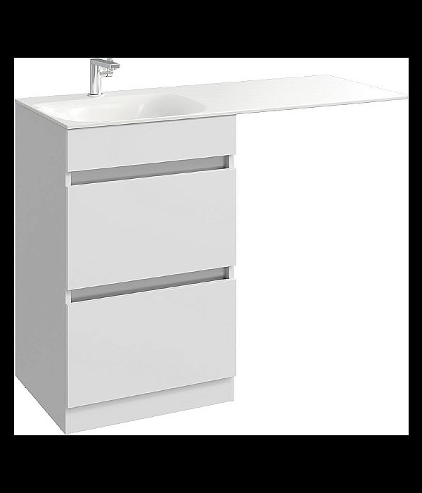 Коллекция Forma представляет собой готовое решение для ванной комнаты со стиральной машиной под единым умывальни- ком-столешницей. Ящики тумб оснащены скрытыми направляющими с системой мягкого закрывания. В комплект тумб входят: специальный сифон, позволяющий экономить пространство мебели, а также кронштейн для крепления крыла умывальника.