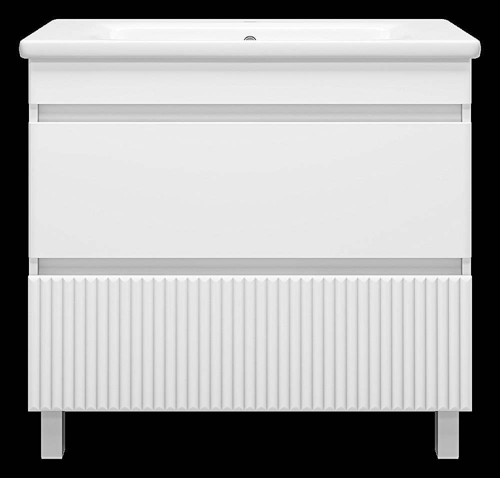 Напольная тумба шириной 90 см с двумя вместительными выдвижными ящиками и декоративным рифлёным фасадом. Выполнена в белом цвете, предназначена для мебельного монтажа раковины.