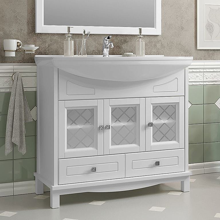 Данный комплект мебели выполнен в классическом стиле и идеально сочетается с элементами из этой коллекции и другими предметами классики, создавая в вашей ванной комнате неповторимый ретро-дизайн.