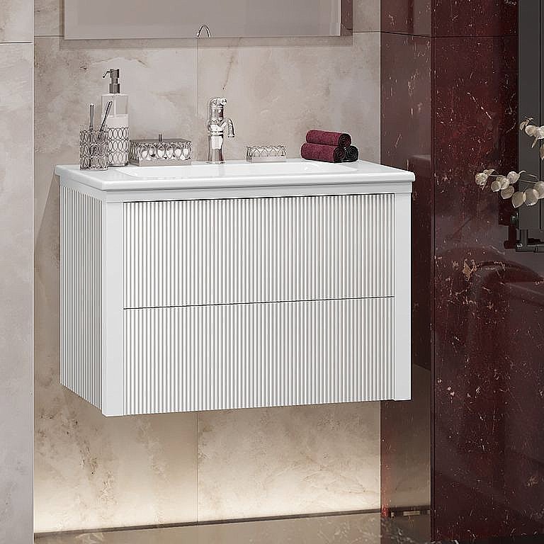 Набор мебели для ванной Опадирис из коллекции Рубинно состоит из раковины и подвесной тумбы, имеющей 2 выдвижных ящика для хранения косметических средств, банных принадлежностей.