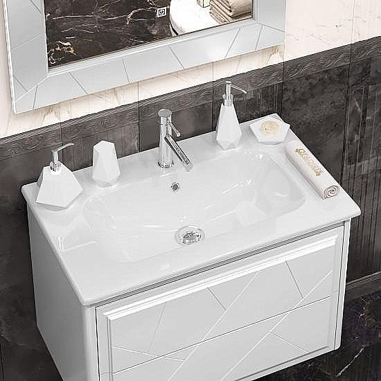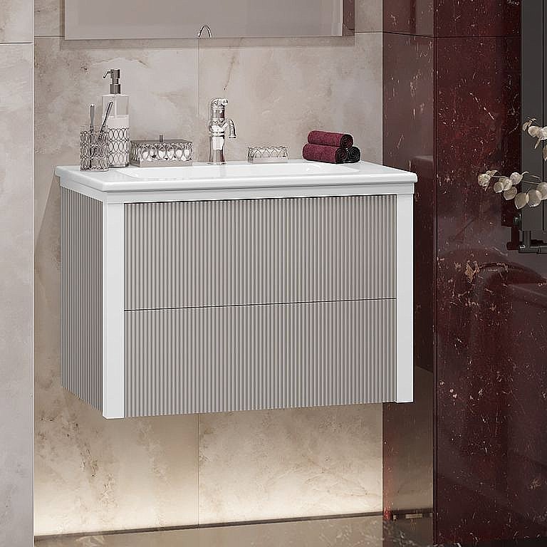 Набор мебели для ванной Опадирис из коллекции Рубинно состоит из раковины и подвесной тумбы, имеющей 2 выдвижных ящика для хранения косметических средств, банных принадлежностей.
